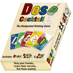 Dose Cocktail is a fun party game of cards. It is the sum total of all Dose games in one nice-looking box. Players race to get rid of all of their cards and prevent other players from doing the same. Each card is a pun and can advance the game or make players drink. Since winning isn’t as important as having a good time, players can band together, chaotically try to make one or every person drunk, or simply try to get rid of their cards as soon as possible.