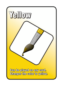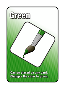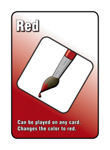 Players may legally play cards the same color as most recently played card OR multicolored cards (which are wild), including the cards with paintbrushes on them (which state their color, as can be seen here).- If player has no card to play, that player must draw two cards and skip his or her turn.